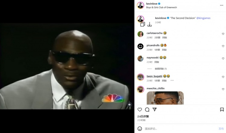与此同时,詹姆斯的好友凯文-乐福也在Instagram上分享了一段迈克尔-乔丹的演讲视频,并幽默地调侃道:“决定二。”这段视频源自于乔丹在2003年于华盛顿MCI中心举行的退役仪式,传达了关于运动生涯和自我选择的重要思想。