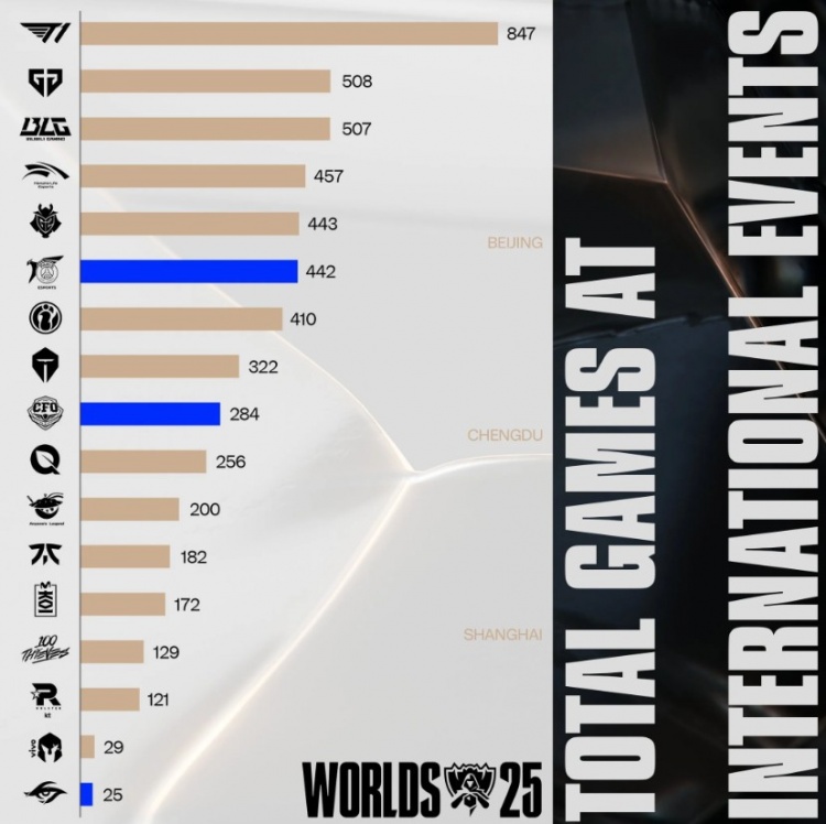 LCP公布各战队选手参加国际赛事的场次数据,T1、GEN和BLG名列前三。_LPL直播